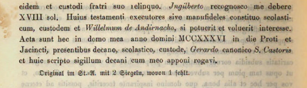 Dieses Testament wurde in meinem Haus am Festtag der Heiligen Protus und Hyacinthus im Jahr des Herrn 1236 verfasst, in Anwesenheit des Dekans, des Scholastikers, des Custos und Gerhard, Kanoniker von St. Castor. Ich bat darum, dass das Siegel des Dekans zusammen mit meinem an dieses Schriftstück angehängt werde.