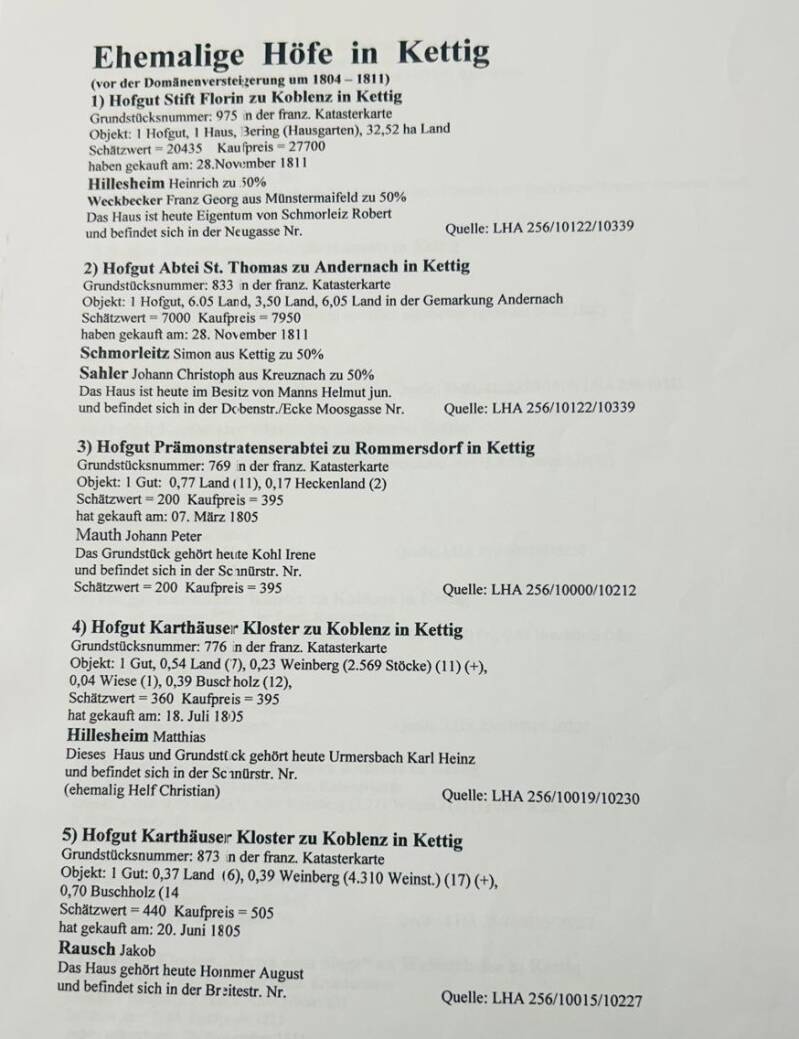 - Die Käufer: Die Ländereien wurden von Privatpersonen aus Kettig und der Umgebung (wie Koblenz, Münstermaifeld oder Kreuznach) ersteigert. Sehr oft taten sich zwei Personen zusammen und erwarben ein Gut gemeinsam (häufig zu je 50 %).