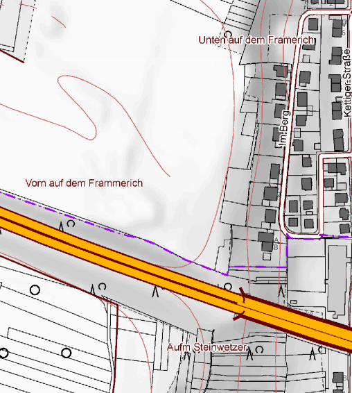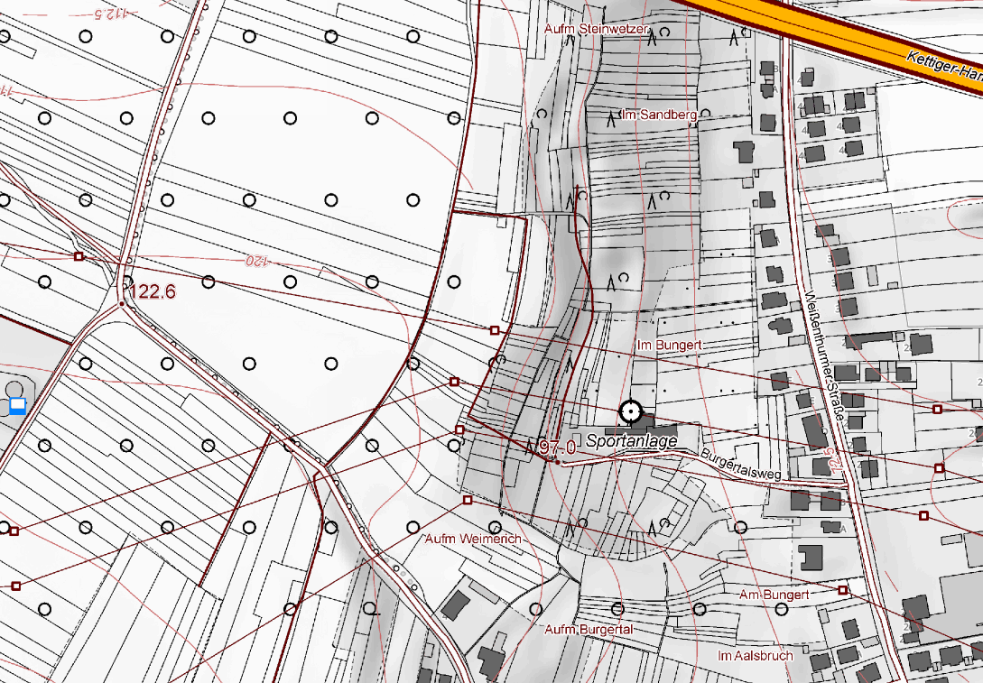 Flur III umfasst die nördlichen und nordwestlichen Bereiche der Kettiger Gemarkung. Hier treffen alte Obststücke, Hanglagen und traditionelle Wege aufeinander. Die Flurnamen dieser Gegend – vom Frammerich über den Steinwetzer bis ins Burgenthal – spiegeln eine Landschaft wider, die seit Jahrhunderten landwirtschaftlich genutzt und zugleich von markanten Geländestrukturen geprägt ist.