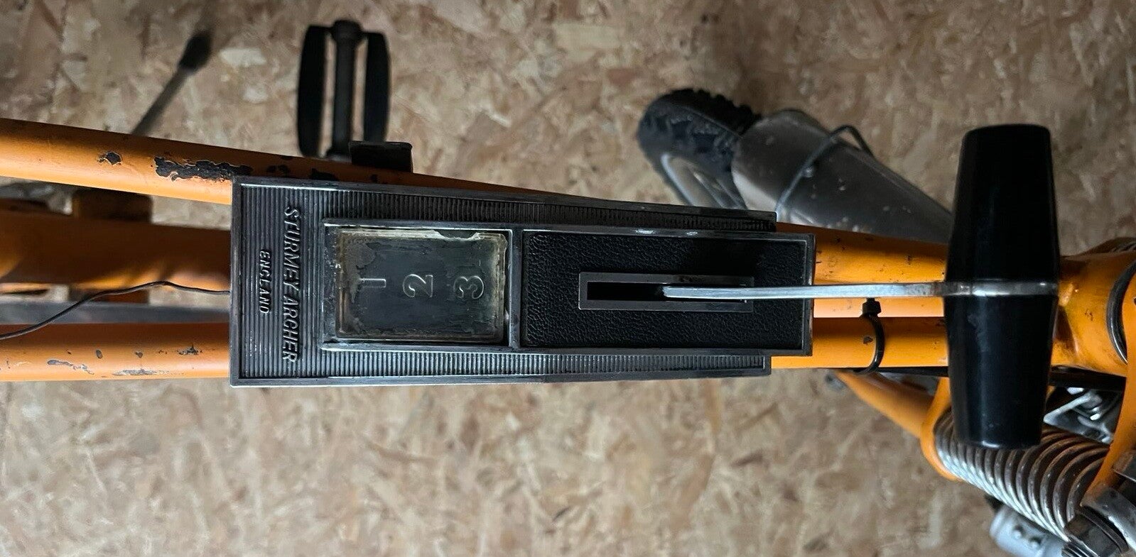 Die 3‑Gang-Schaltung von Sturmey Archer sitzt gut sichtbar auf dem Oberrohr und unterstreicht den technischen Anspruch des Rades.