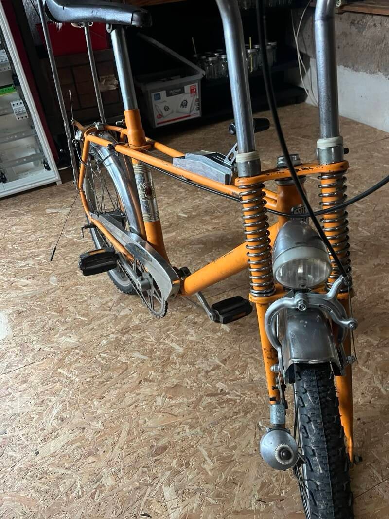 Dieses Bonanza-Fahrrad ist ein typisches Beispiel für die jugendliche Fahrradkultur der 1970er Jahre. Mit seinem langen Bananensattel, den hochgezogenen „Apehanger“-Lenkern, dem großen Frontscheinwerfer und der Federung am Vorderrad orientiert es sich klar an den Chopper-Motorrädern, die damals als Inbegriff von Freiheit galten.