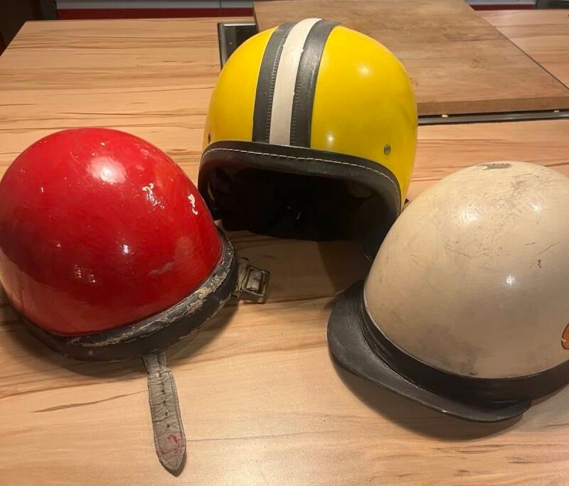 Die drei Helme zeigen unterschiedliche Designs und Farben, typisch für die Motorradkultur der Nachkriegszeit: