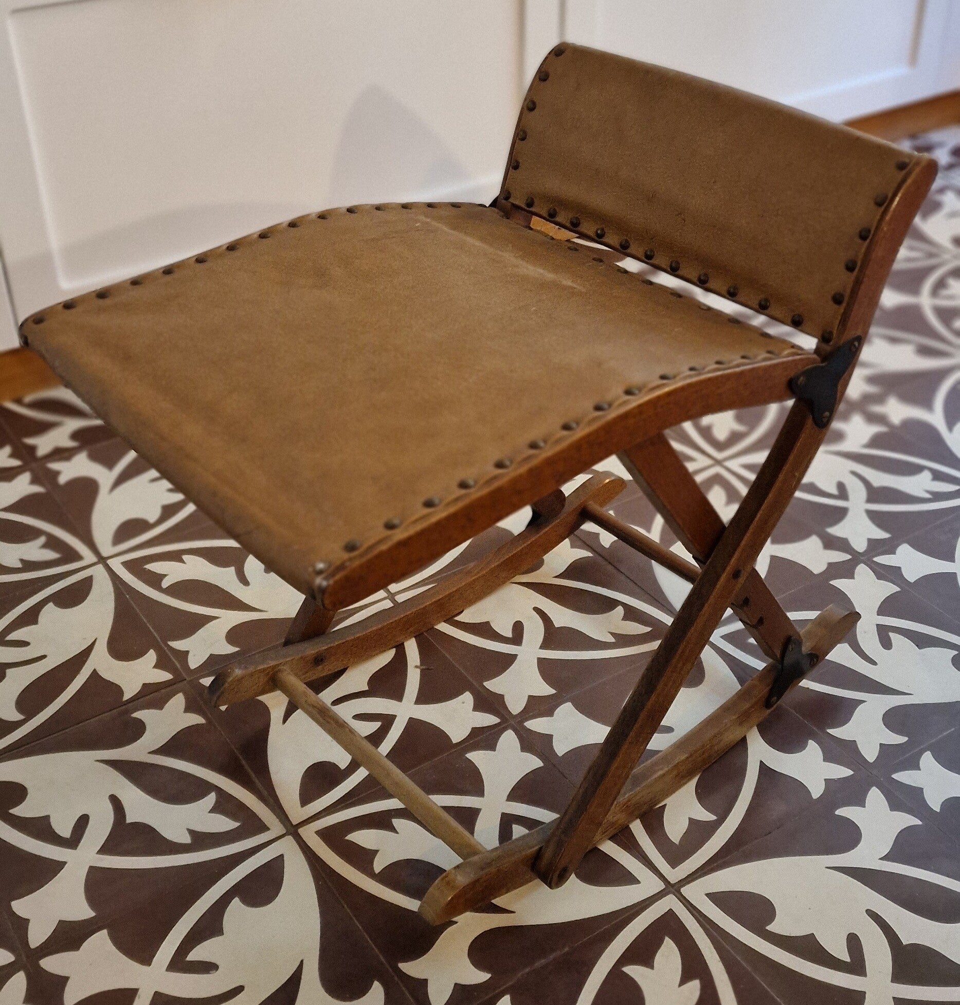 Durch die variable Rahmenkonstruktion kann die Höhe leicht angepasst werden – ein Hinweis darauf, dass das Möbelstück für bequeme Fußablage gedacht war, etwa vor einem Sessel oder Sofa.