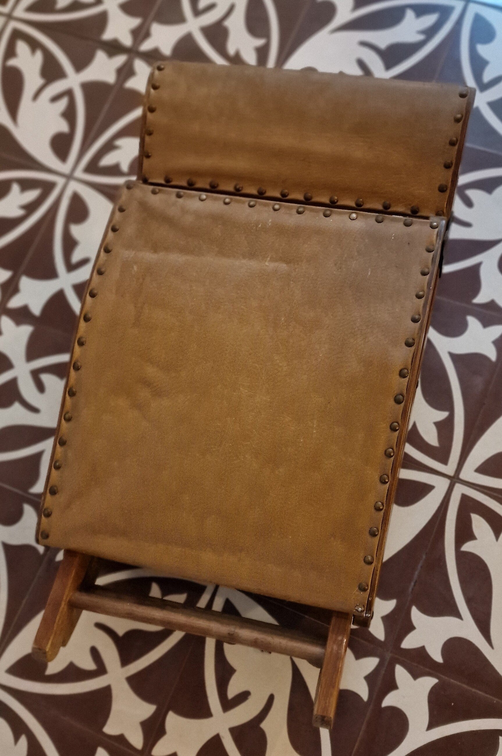 Die Kombination aus Holz, Lederoptik und Nieten spiegelt den Geschmack einer Zeit wider, in der Möbel sowohl praktisch als auch dekorativ sein sollten.