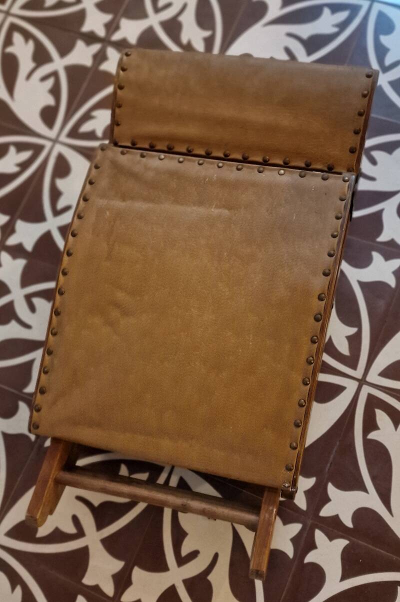 Die Fußbank besteht aus einem klappbaren Holzrahmen, der sich vollständig zusammenlegen lässt. Die Sitz‑ bzw. Auflagefläche ist mit Leder oder Kunstleder bespannt und entlang der Kanten mit Zier- und Haltnieten befestigt.
