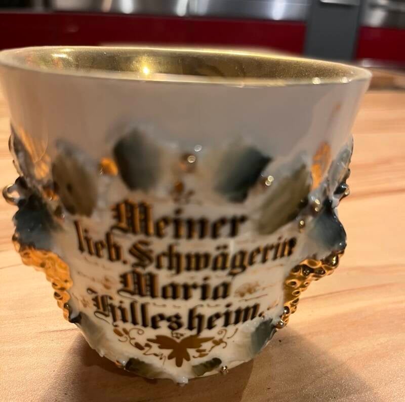 Diese Kombination aus Bildmotiv und persönlicher Beschriftung macht die Tasse zu einem Erinnerungsstück mit familiärer Bedeutung. Die Goldverzierung im Inneren und die geschwungene Henkelgestaltung unterstreichen den festlichen Charakter – vermutlich ein Geschenk zu einem besonderen Anlass wie Verlobung, Hochzeit oder Besuch.