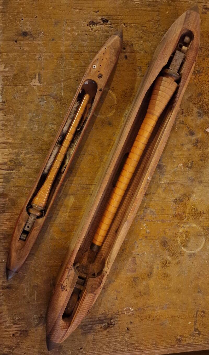 Die beiden Exemplare zeigen typische Gebrauchsspuren: abgenutztes Holz, Garnreste und handwerkliche Patina. Sie wurden vermutlich in einem Handwebstuhl verwendet, wie er in ländlichen Haushalten oder kleinen Werkstätten üblich war.