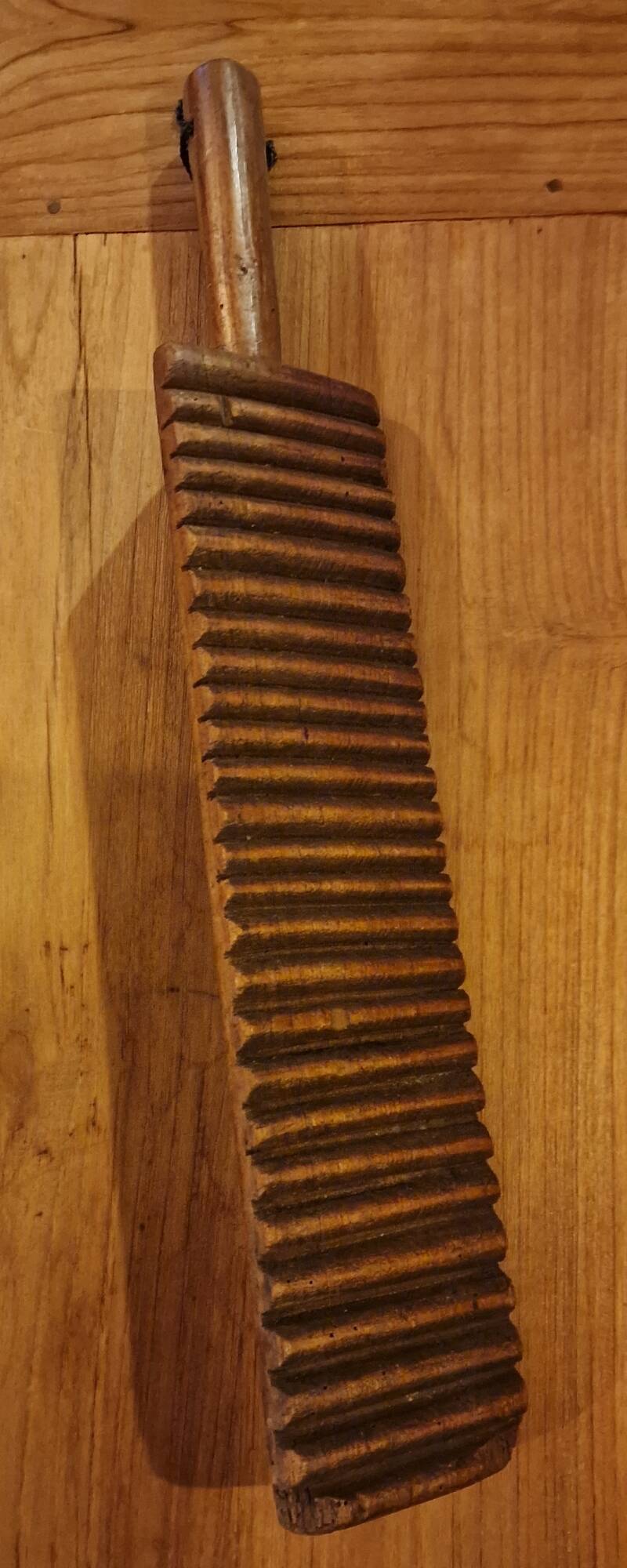 Der Griff am oberen Ende erleichtert das Halten oder Fixieren des Brettes, während die Rillen für Reibung und Führung sorgen. In Kombination mit einem Flachskamm oder einer Breche wurde das Material so auf die Weiterverarbeitung vorbereitet – etwa zum Spinnen.