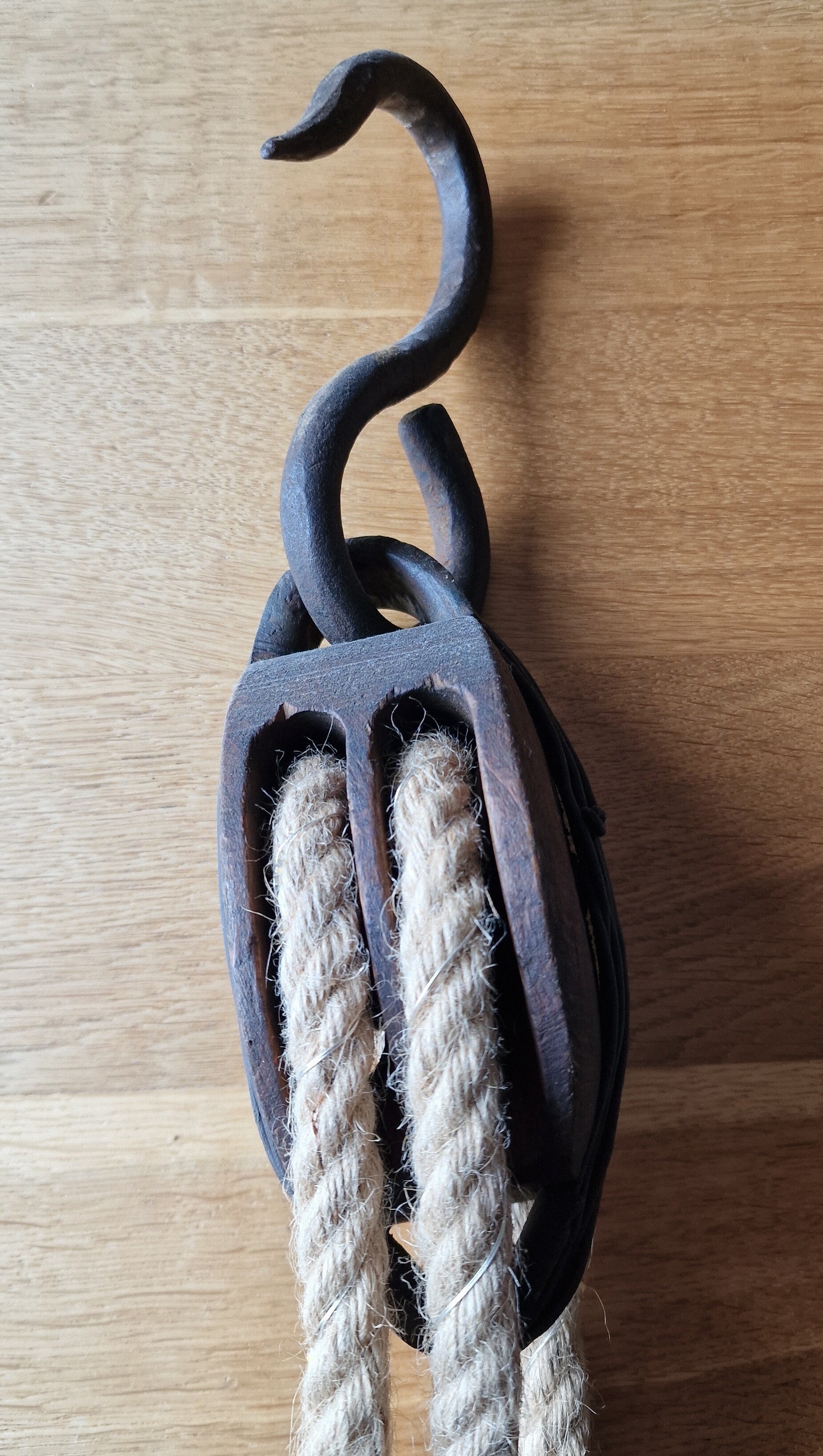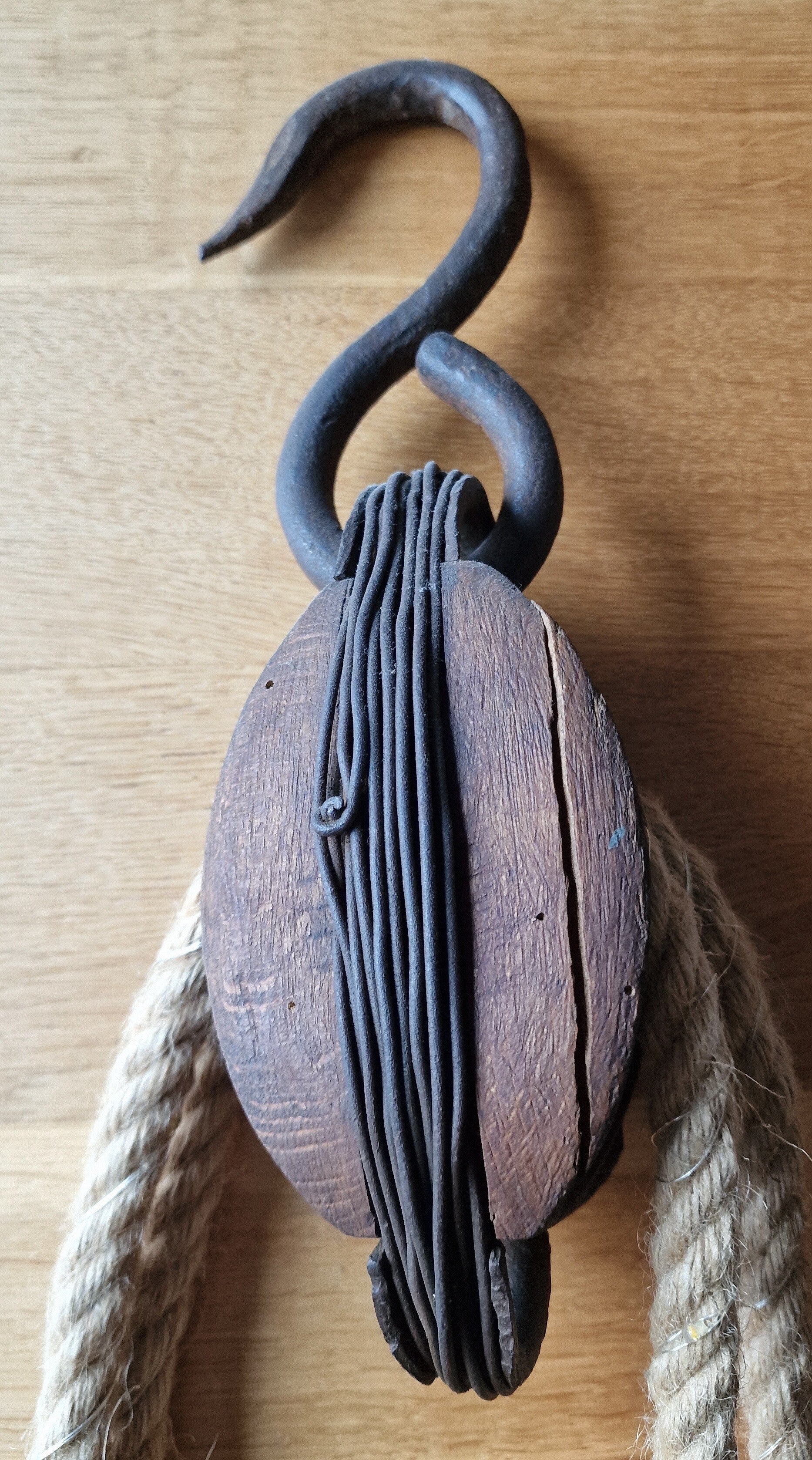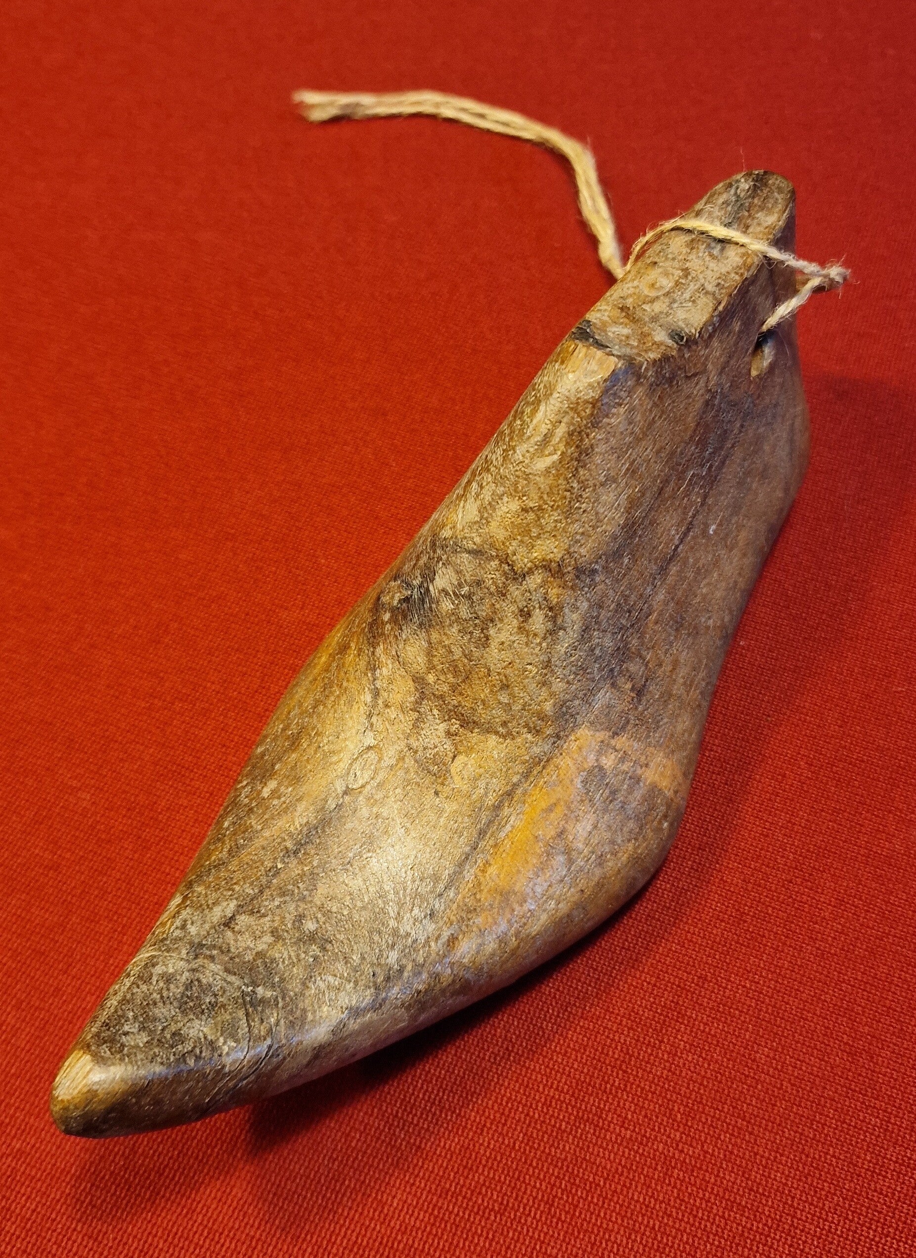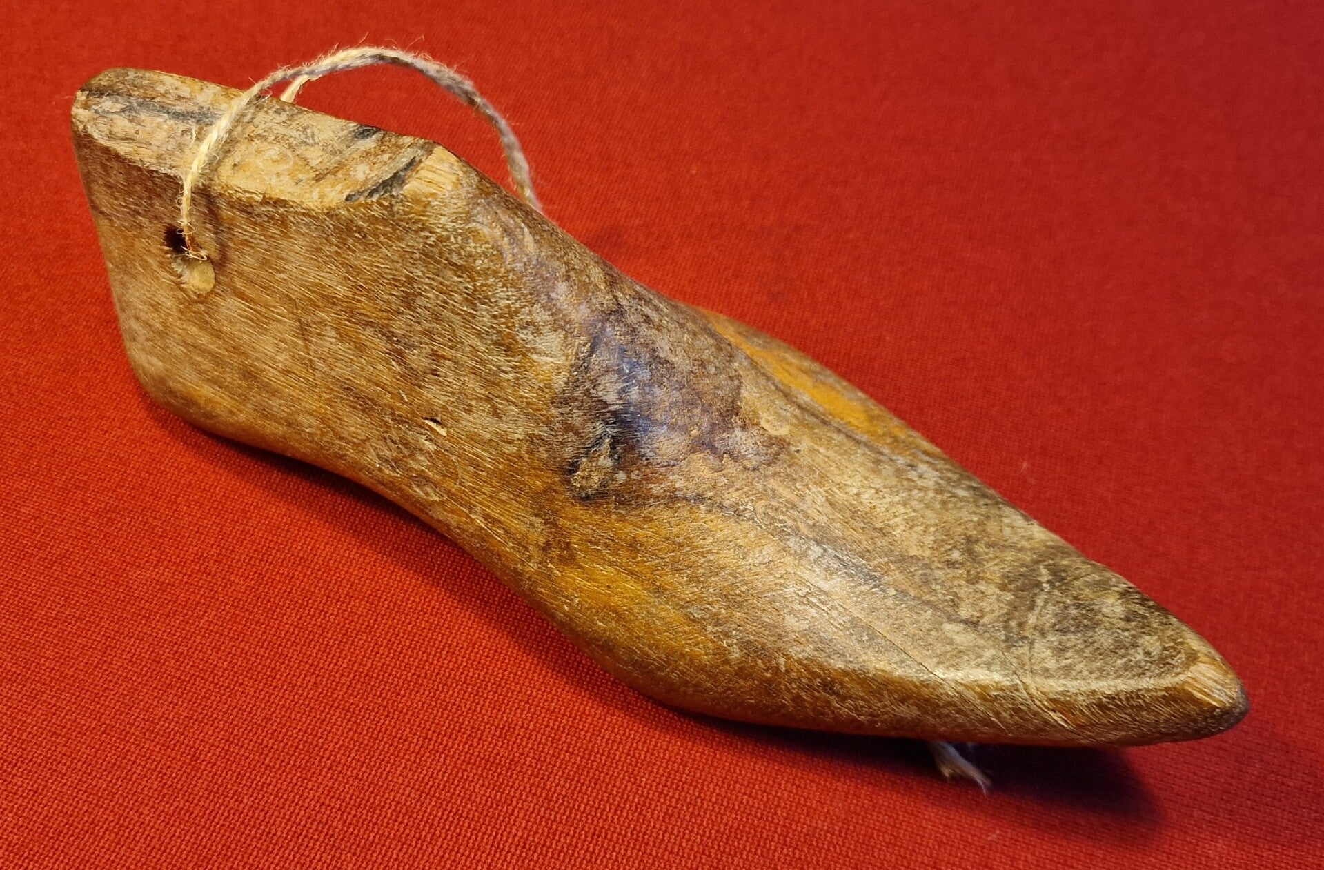 Die glatte Oberfläche erleichtert das Einpassen des Leders, während die Bohrung mit Schnur eine praktische Aufhängung zur Lagerung oder Trocknung erlaubt. Solche Leisten waren unverzichtbar für die präzise Arbeit des Schuhmachers.