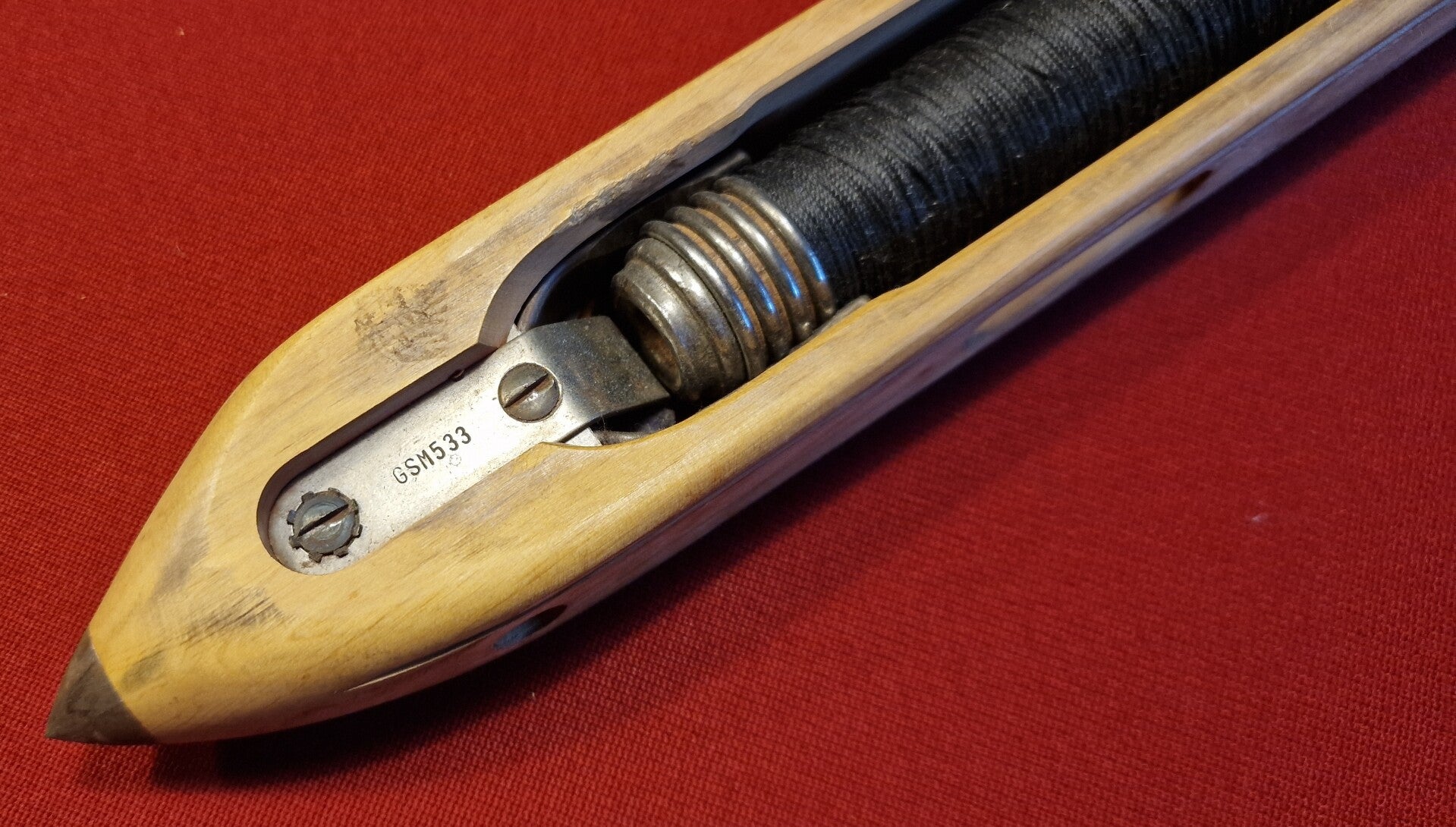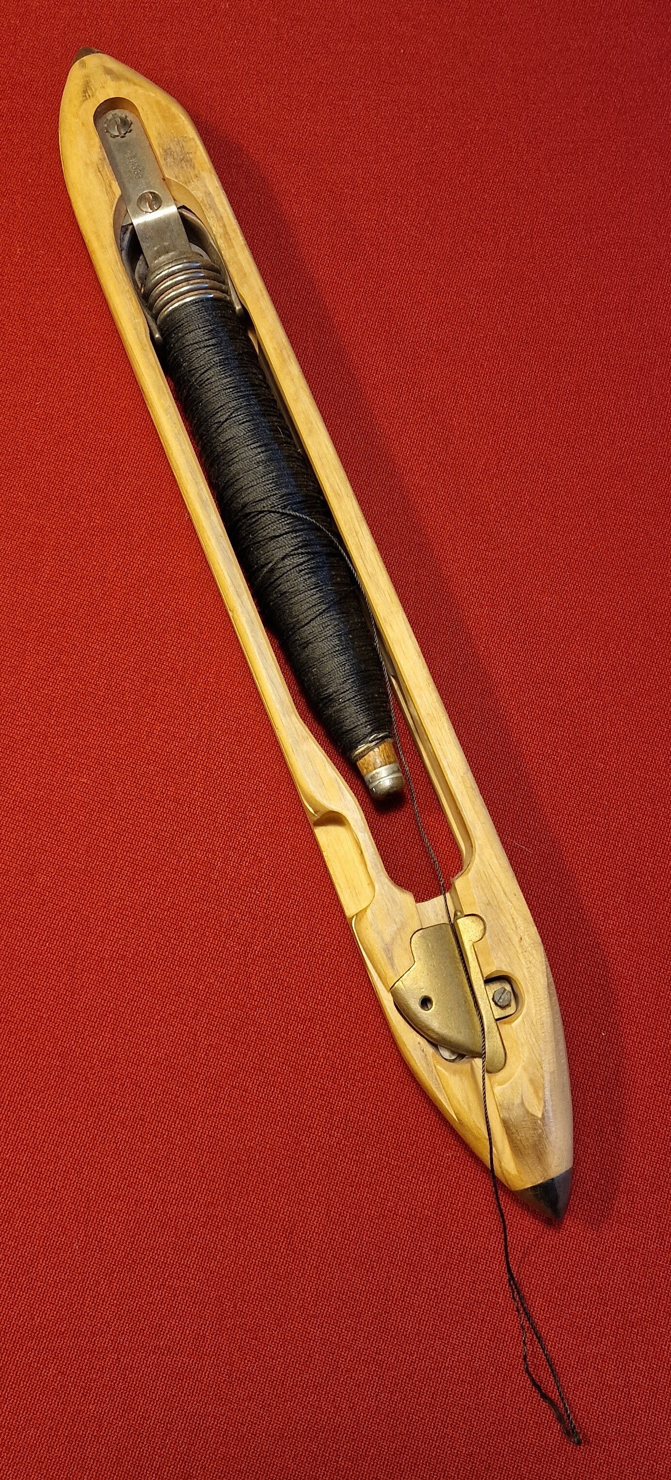 Die Metallteile sorgen für Stabilität und Führung, während die glatte Oberfläche Reibung minimiert. Anders als bei handgeführten Schiffchen steht hier die Effizienz im Vordergrund – das Schiffchen ist Teil eines rhythmischen, maschinellen Prozesses.