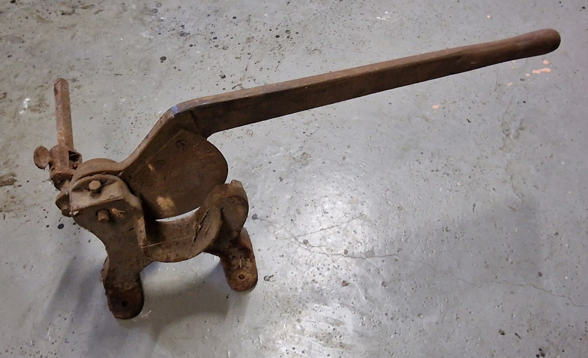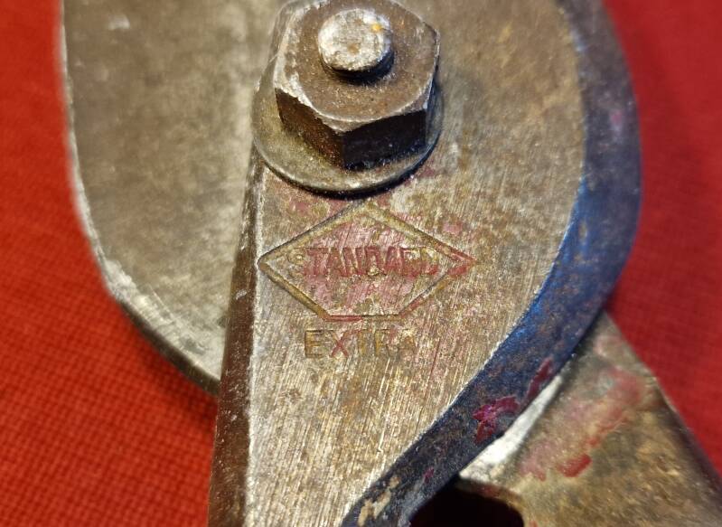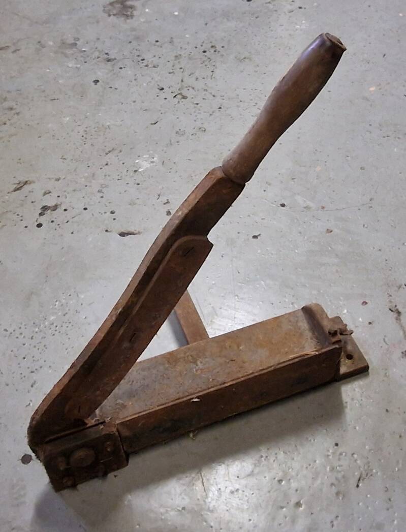 Das Gerät ist ein schweres, handbetriebenes Schneidewerkzeug, das mit seinem langen Hebelarm und der massiven, fest verschraubbaren Grundplatte eindeutig für Arbeiten gedacht war, bei denen viel Druck und ein sauberer Schnitt erforderlich sind. Die Bauform weist auf ein Werkzeug hin, das in kleinen Werkstätten, landwirtschaftlichen Haushalten oder im Handwerk eingesetzt wurde, um flache oder gebündelte Materialien zu kürzen.