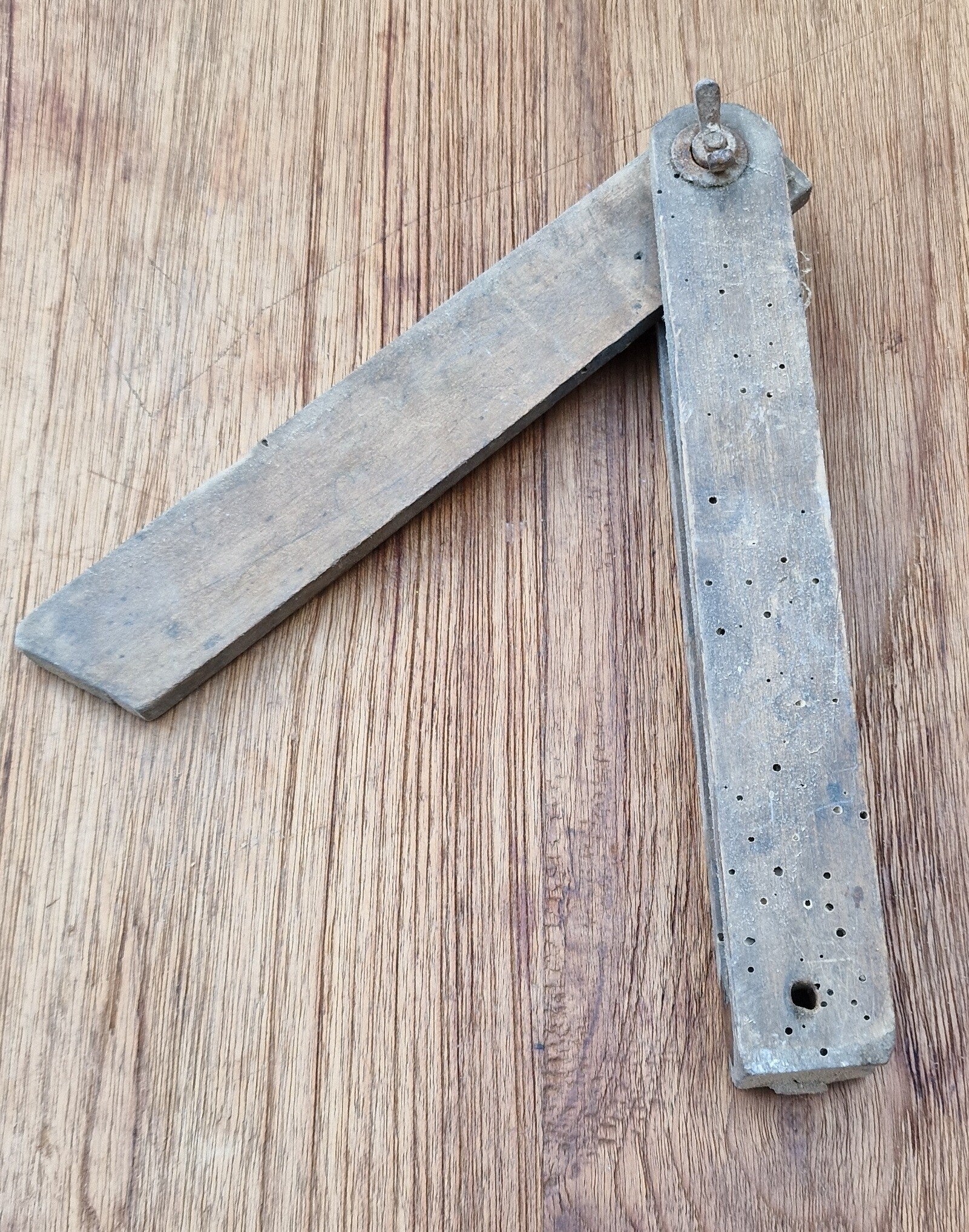Zustand: stark gebraucht, mit deutlichen Spuren manueller Arbeit; Holz trocken und rissig, aber stabil