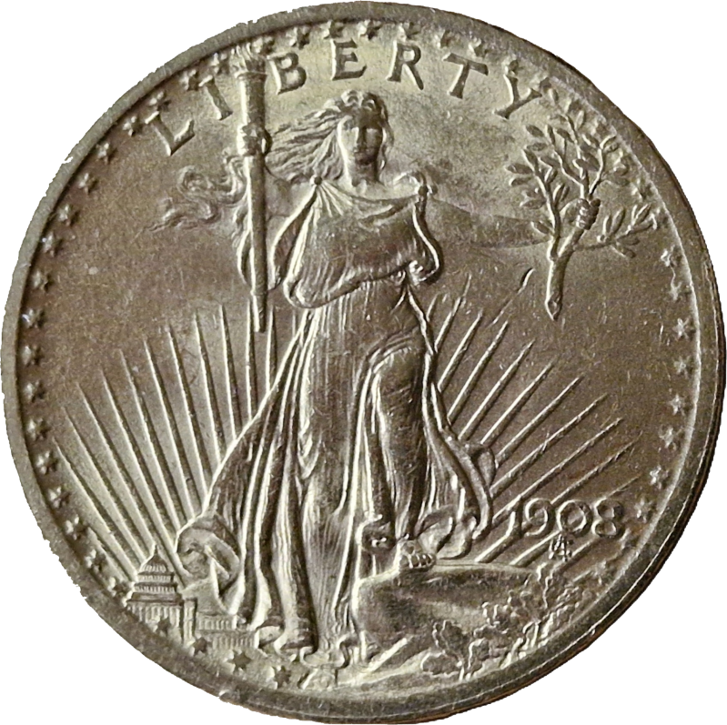 Die amerikanische 20‑Dollar‑Goldmünze von 1908, gestaltet vom Bildhauer Augustus Saint‑Gaudens, gilt als eine der künstlerisch bedeutendsten Münzen der Welt. Ihr klassizistisches Motiv, die dynamische Darstellung von Lady Liberty und der majestätische Adler auf der Rückseite machten sie zu einem Symbol amerikanischer Identität, Modernität und künstlerischer Ambition zu Beginn des 20. Jahrhunderts.
