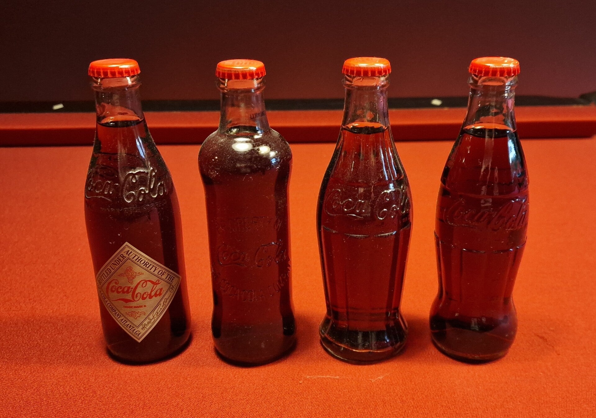 Alle Flaschen sind mit roten Kronkorken verschlossen und enthalten das Originalgetränk. Die Konturflasche wurde zum Markenzeichen – weltweit wiedererkennbar und ikonisch.