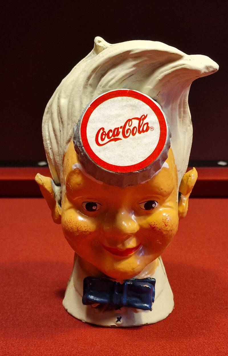 Die Spardose zeigt den sogenannten „Sprite Boy“, eine Werbefigur der Coca-Cola Company aus den 1940er–1950er Jahren. Charakteristisch sind: