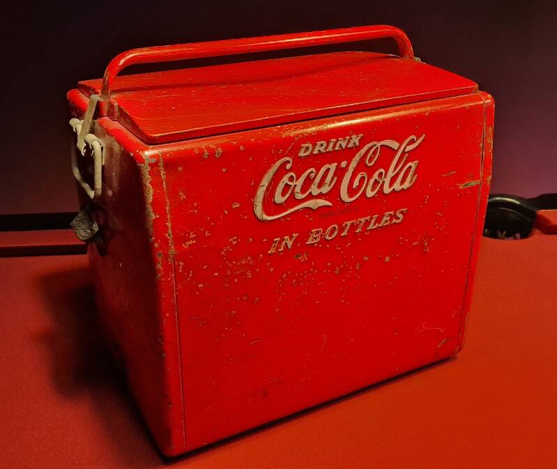 Der rot lackierte Metallkühler trägt die klassische weiße Coca-Cola-Schrift „DRINK Coca-Cola IN BOTTLES“ – ein ikonisches Werbemotiv der Mitte des 20. Jahrhunderts.