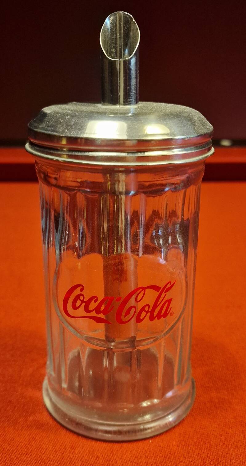 Dieser Glasstreuer mit dem roten Coca‑Cola‑Schriftzug gehört zu den typischen Werbe‑ und Gebrauchsartikeln, die im 20. Jahrhundert in Gaststätten, Imbissen und Haushalten weit verbreitet waren. Das klare Pressglas ist mit vertikalen Rillen versehen, die für guten Halt sorgen und zugleich den klassischen Look amerikanischer Diner‑Kultur zitieren.