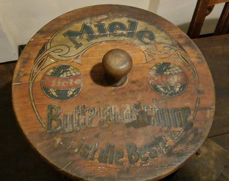 Die Aufschrift „Miele Buttermaschine ist die Beste“ verweist auf die bekannte Haushaltsgerätefirma, die auch in der frühen Milchtechnik aktiv war.