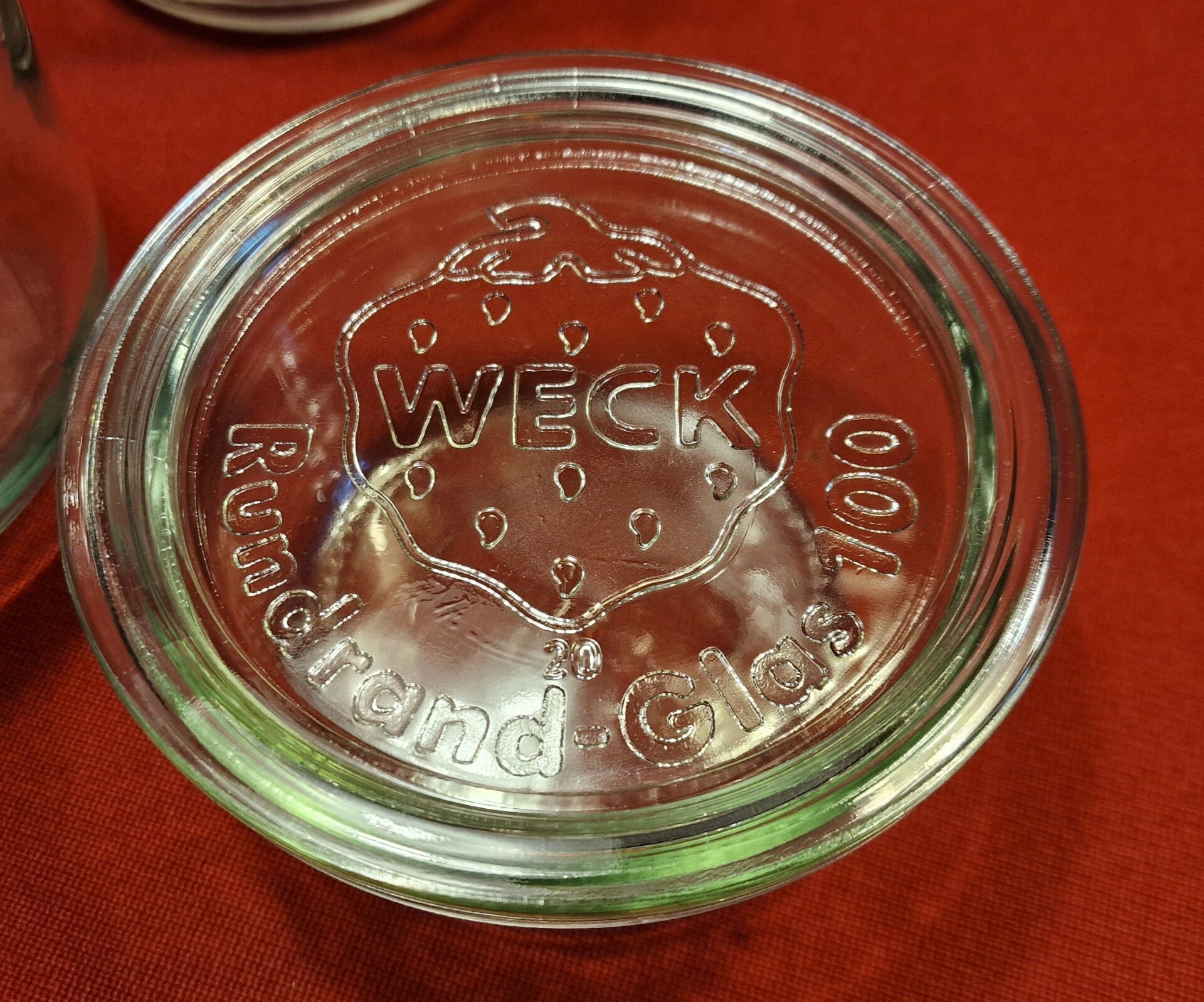 - Verschlussprinzip: Glasdeckel, roter Gummiring, zwei Federklammern