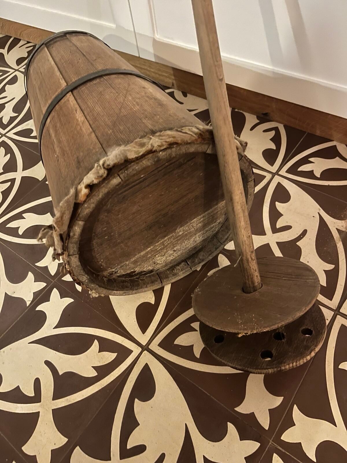 In der Seitenansicht zeigt sich die robuste Fasskonstruktion mit leicht konischer Form, während die Draufsicht den eingesetzten Stampfer mit gelochter Quirlplatte offenbart – ein funktionales Detail zur besseren Durchmischung des Rahms. Das Fass wurde zur Herstellung von Butter verwendet, indem süßer oder saurer Rahm durch rhythmisches Stampfen mechanisch getrennt wurde in Butter und Buttermilch.