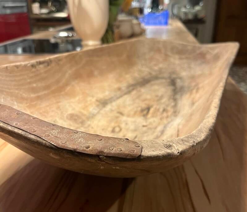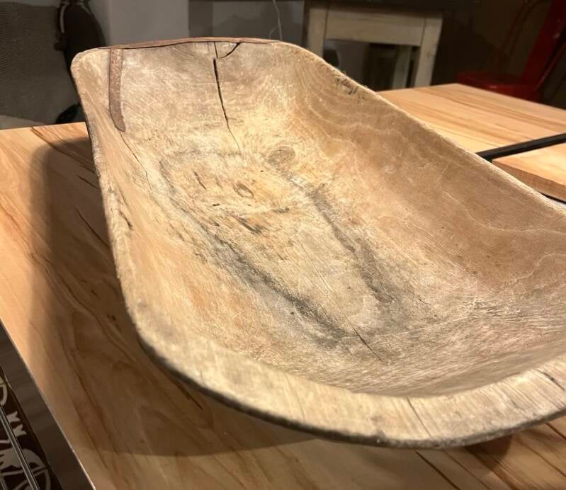 Die längliche Holzmulde wurde aus einem einzigen Stück Holz gefertigt und zeigt deutliche Gebrauchsspuren: dunkle Flecken, Rissbildung und eine metallene Verstärkung am Rand – Hinweise auf langjährige Nutzung und Reparatur.