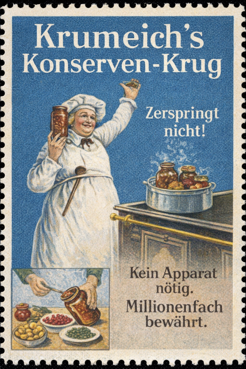 Krumeich bewarb seine Konservenkrüge mit markanten, zeittypischen Slogans, die auf Reklamemarken und Händlerkarten gedruckt wurden: