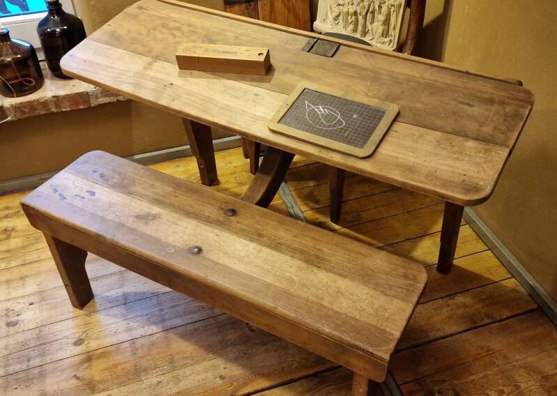 Diese Schulbank steht exemplarisch für den Alltag in der „Kettijer Schull“, wie ihn Generationen erlebt haben: mit Griffel und Tinte, mit Rechenaufgaben auf der Tafel und dem Geruch von Bohnerwachs im Flur.
