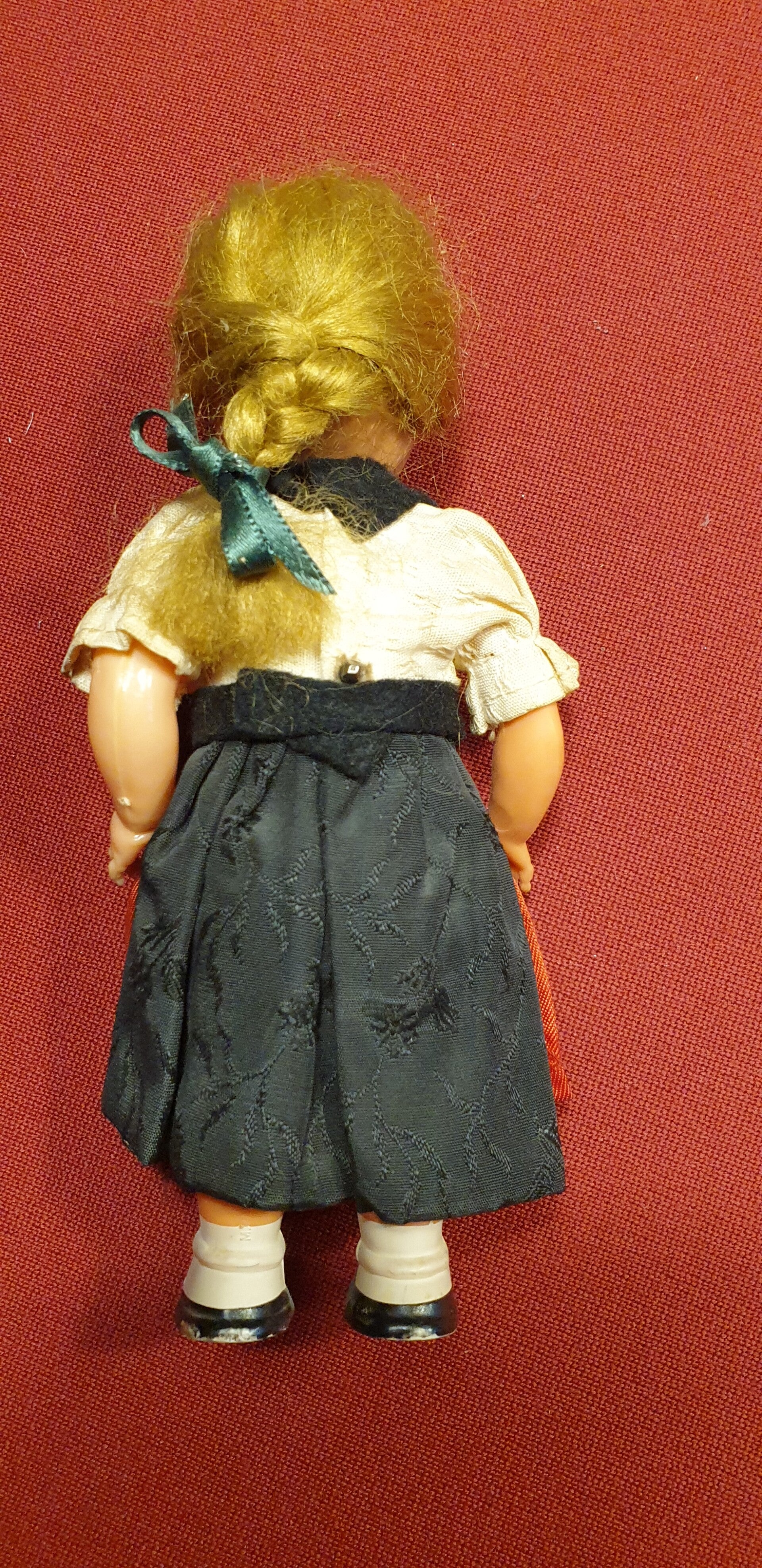 Die Kleidung ist fest vernäht, die Glieder sind beweglich, und die gesamte Erscheinung erinnert an eine Miniaturtrachtenträgerin, wie sie in der Nachkriegszeit als Spielzeug oder Souvenir beliebt war.