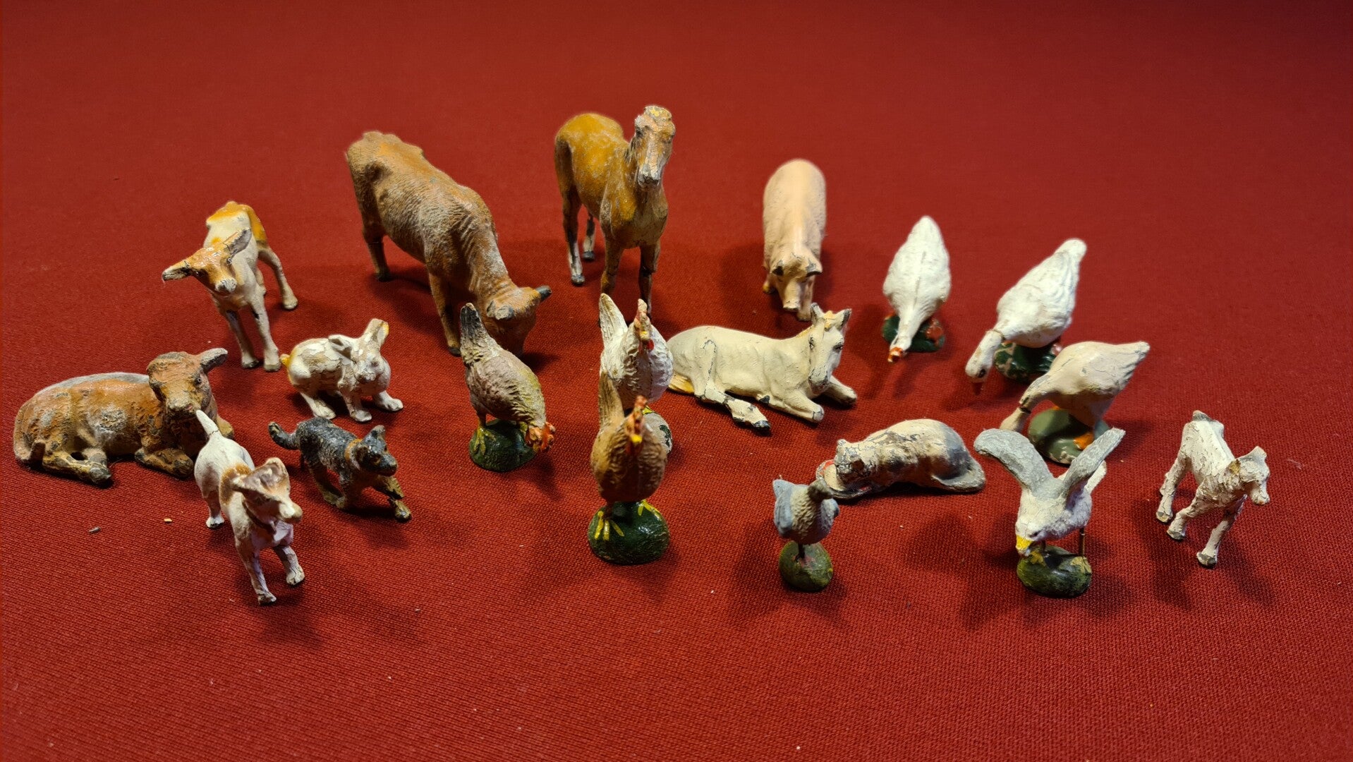 Die Tierfiguren – darunter Pferd, Kuh, Schwein, Huhn, Hund – sind ebenfalls aus Masse oder Metall gefertigt, teils mit Prägung („BLASTUN“) und zeigen Spielspuren und Lackverluste, wie sie bei intensiv genutztem Spielzeug üblich sind.