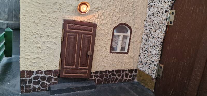 Dieser handgefertigte Bauernhof aus Holz wurde Ende der 1930er Jahre der damals etwa zwölfjährigen Leni Hillesheim geschenkt und kurz darauf an ihren jüngeren Bruder Anton weitergegeben. In den frühen 1960er Jahren restaurierte Anton den Hof gemeinsam mit seinem Freund Werner Sorger, der die heute noch erhaltene Bemalung von Schornsteinen und Sockel ausführte.