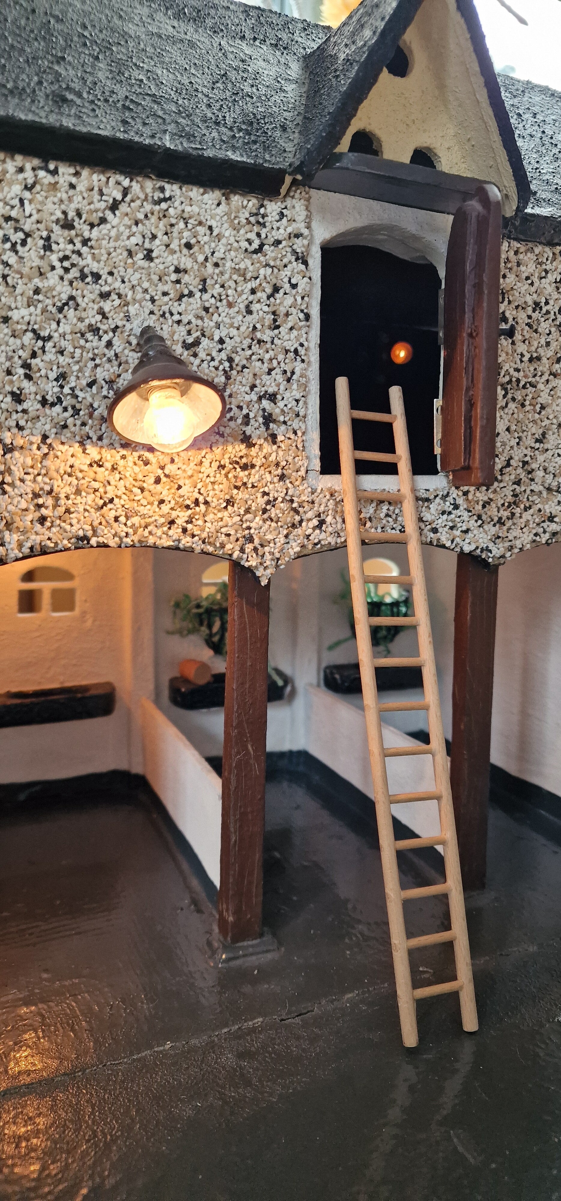 Material: Holz, bemalt; ergänzt durch Kunststoffteile (Schleich, Playmobil)