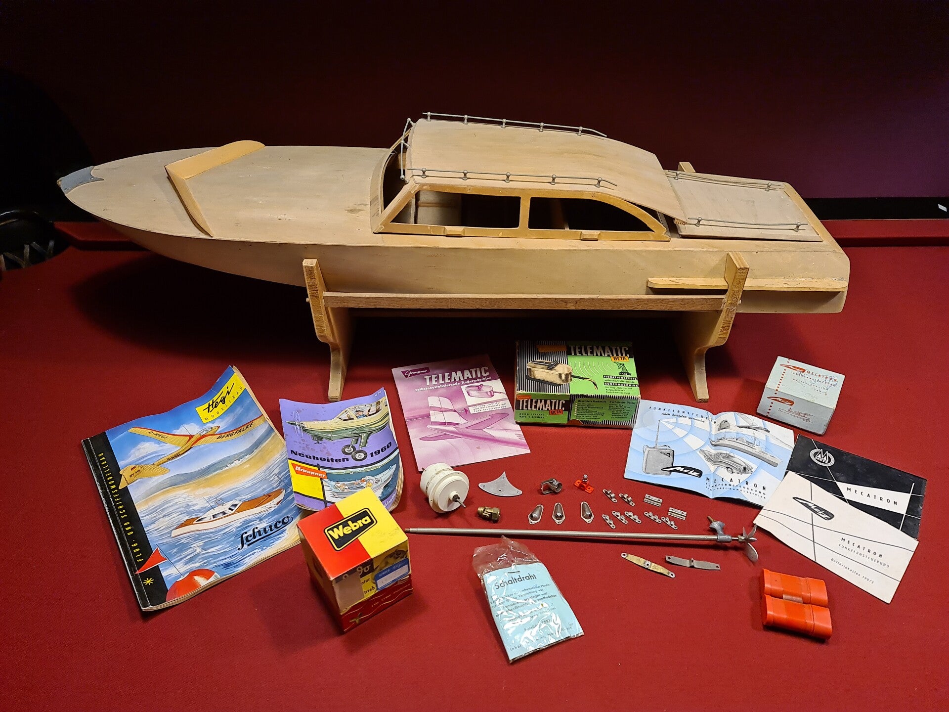 Zum Fund gehören zahlreiche Originalteile und Zubehörkomponenten: Antriebselemente, Propeller, Kupplungen, Steuerungsteile sowie zeitgenössische Kataloge und Bauanleitungen von Hegi, Helatron, Webra und Telematic. Diese Dokumente zeigen, wie ambitioniert das Projekt ursprünglich angelegt war.