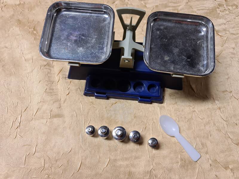 Die dazugehörige Waage ist ebenfalls aus Kunststoff gefertigt und mit zwei Schalen sowie einem Satz Metallgewichte ausgestattet. Sie erlaubt das spielerische Abwiegen von Gegenständen und vermittelt erste Erfahrungen mit Mengen und Gleichgewicht.