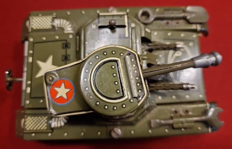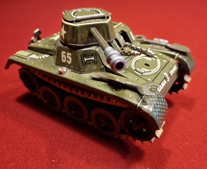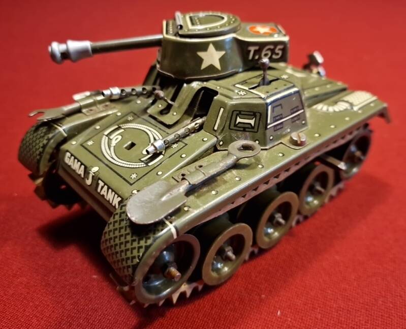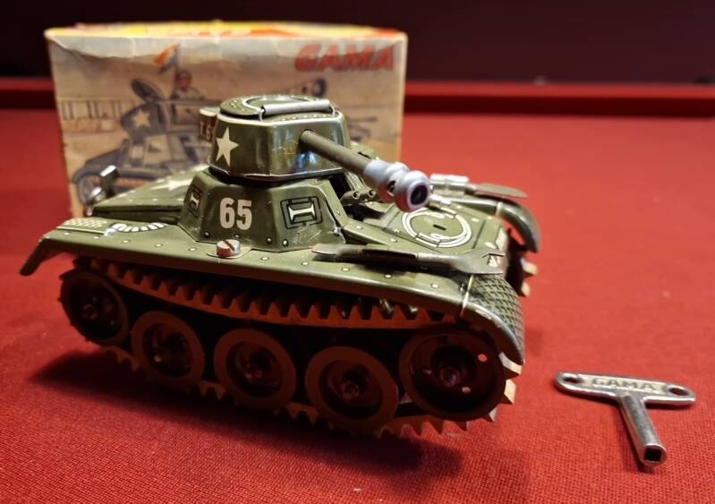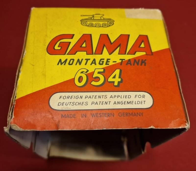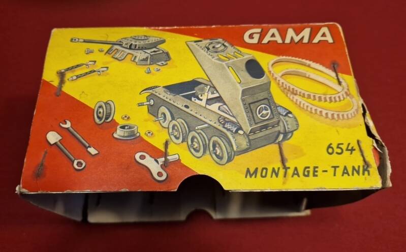 Dieser GAMA Montage‑Tank 654 ist ein hervorragend erhaltenes Beispiel für westdeutsches Blechspielzeug der frühen Nachkriegszeit. Besonders bemerkenswert ist, dass das Objekt vollständig vorliegt: der Tank selbst, der Original‑Aufziehschlüssel, das am Fahrzeug befestigte Werkzeugset (Schaufel und Schraubenschlüssel) sowie der Originalkarton mit aufgedruckter Aufbau‑ und Bedienungsanleitung.