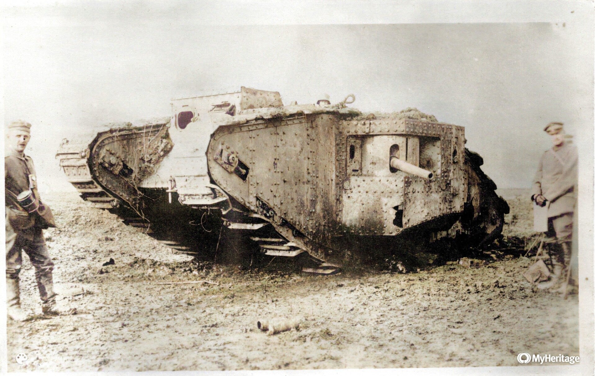 Für viele Soldaten war der Anblick eines Panzers 1917 noch etwas Neues und Bemerkenswertes — entsprechend häufig tauchen solche Motive in Feldpostkarten auf.