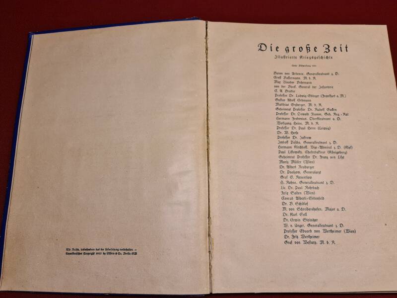 Der erste Band der Reihe „Die große Zeit“ ist ein umfangreich gestaltetes Werk zur Darstellung des Ersten Weltkriegs aus zeitgenössischer Perspektive. Die Reihe erschien bereits während des Krieges und diente der patriotischen Mobilisierung, der Selbstdarstellung des Kaiserreichs und der emotionalen Bindung der Heimatbevölkerung an das Kriegsgeschehen.
