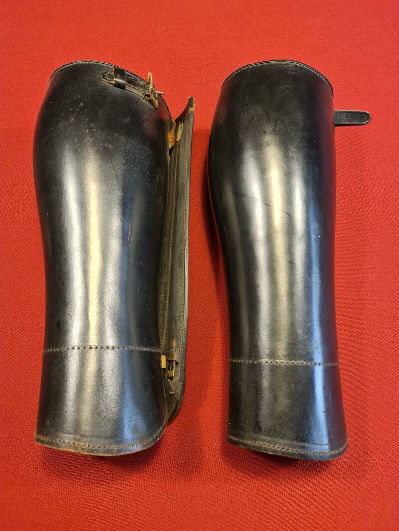 Die Gamaschen bestehen aus robustem Leder und werden über dem Schuh und dem unteren Hosenbein getragen. Sie lassen sich seitlich mit einem Reißverschluss schließen und zusätzlich mit einer Schnalle fixieren. Diese Kombination schützt vor Schmutz, Nässe und mechanischer Belastung – etwa beim Marschieren, Arbeiten im Gelände oder Reiten.
