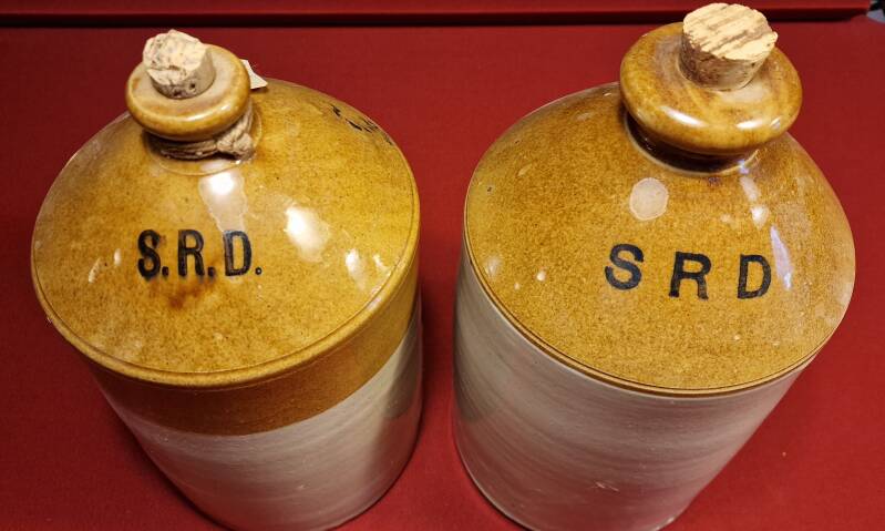Die beiden Krüge bestehen aus robustem Steinzeug mit einer braunen Salzglasur im oberen Bereich und einem naturfarbenen unteren Teil. Beide tragen die Aufschrift „S.R.D.“ bzw. „SRD“ in schwarzer Schrift – teils klar, teils durch Glasur leicht überdeckt.