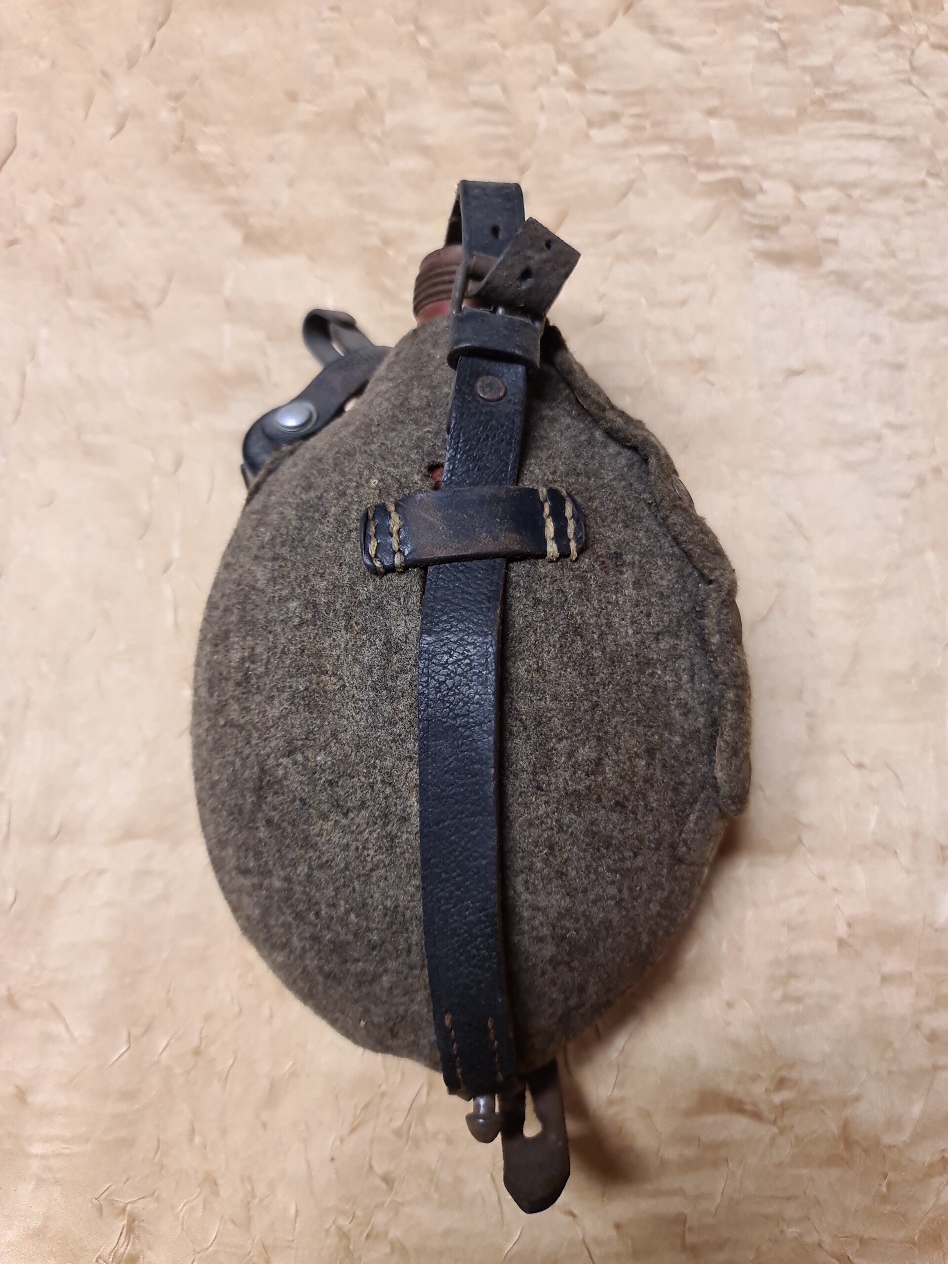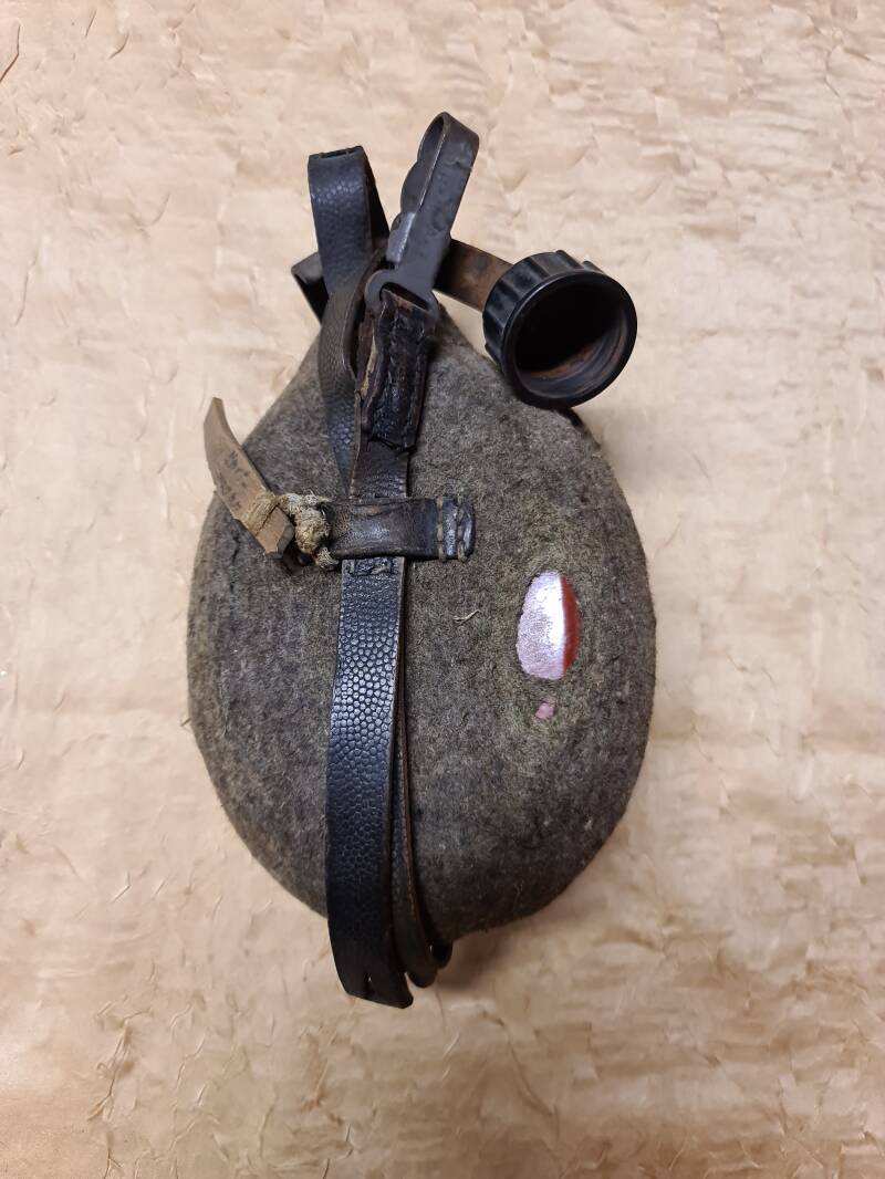 Material: Aluminiumflasche mit Wollfilzüberzug, Lederriemen, Metallbeschläge