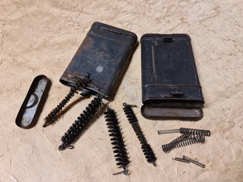 Das Set besteht aus zwei flachen Metallbehältern mit Klappdeckel, die jeweils eine Auswahl an Drahtbürsten unterschiedlicher Durchmesser sowie Spiralfedern und Reinigungswerkzeuge enthalten. Die Bürsten sind für das Reinigen von Rohren, Läufen oder anderen schwer zugänglichen technischen Komponenten konzipiert – etwa bei Feuerwaffen, Maschinen oder landwirtschaftlichen Geräten.