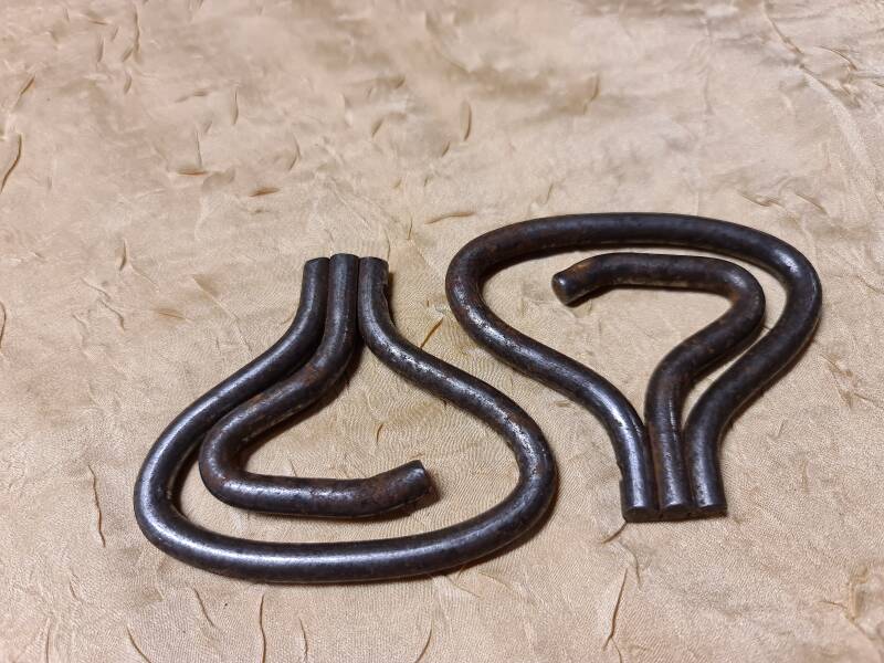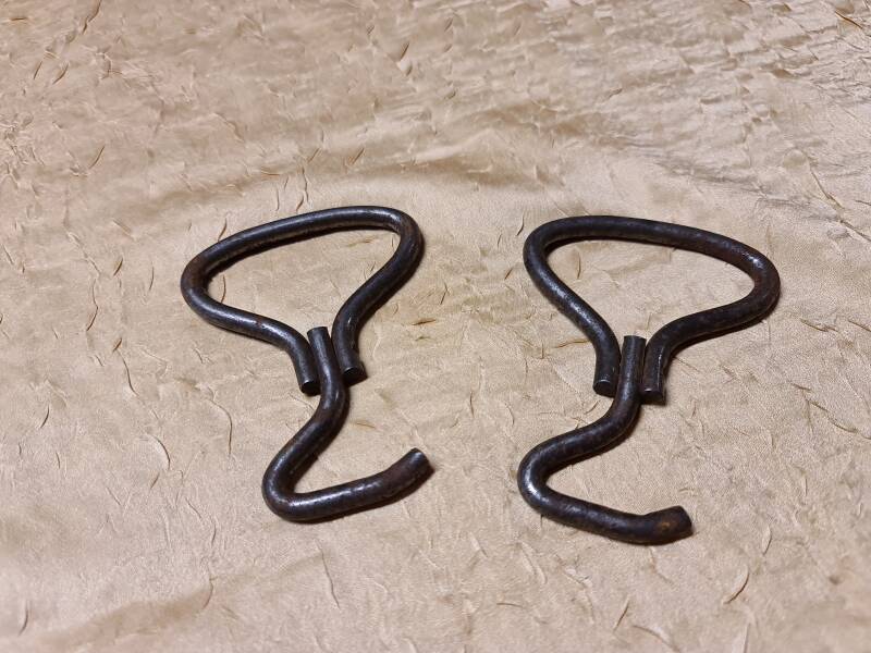 Die beiden Fotos zeigen ein einziges Paar Stiefelanziehhilfen, gefertigt aus mehreren miteinander verbundenen Drahtsegmenten. Die Konstruktion ist klappbar, sodass die Hilfen sowohl flach zusammengelegt als auch in eine geöffnete Arbeitsposition gebracht werden können.