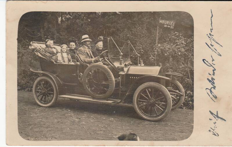 Diese Fotografie zeigt ein offenes Automobil mit fünf Personen, aufgenommen in einem französischen Ort nahe Mouriès. Die Kleidung der Personen und der Fahrzeugtyp weisen auf die Zeit des Ersten Weltkriegs hin. Das Bild wirkt auf den ersten Blick wie eine zivile Alltagsszene — doch die handschriftliche Rückseite offenbart seine eigentliche Bedeutung.